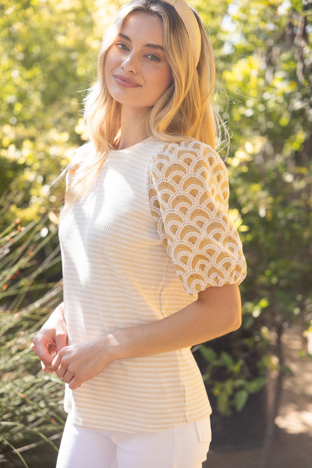 Elevate your wardrobe with this meticulously crafted Embroidered Scallop Sleeve Striped Knit Top. The distinctive scallop sleeve detailing adds architectural interest while delicate embroidery provides artisanal character. Constructed from premium knit fabric with a classic striped pattern, this versatile piece transitions seamlessly from casual daywear to evening occasions. The thoughtful design ensures both comfort and sophisticated style.