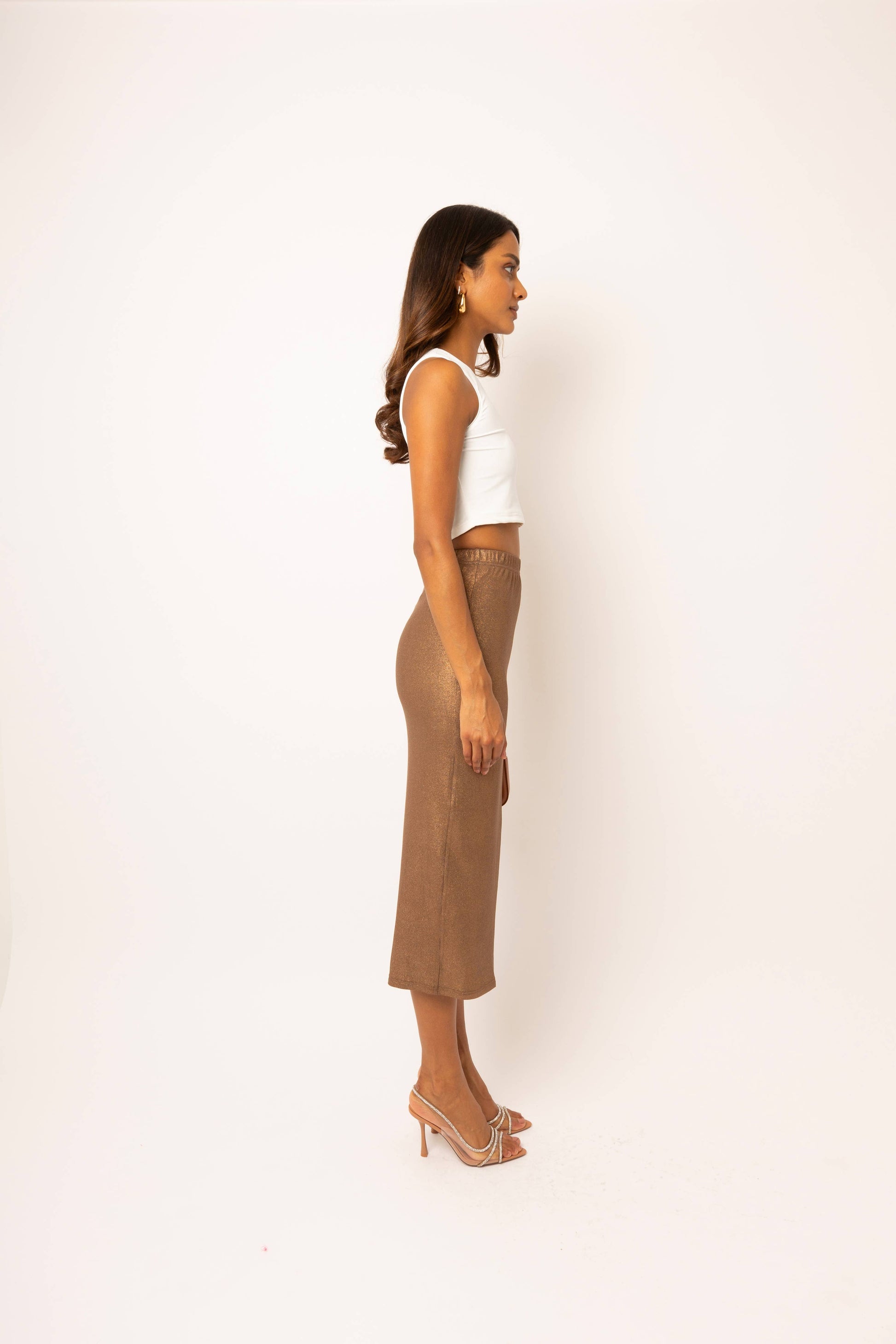 Elevate your everyday style with the Metallic Latte Midi Skirt, a versatile piece crafted from luxuriously soft foil-coated jersey stretch fabric. The elasticated waist ensures a comfortable, flattering fit, while the midi length offers timeless sophistication. Transition seamlessly from casual to polished—pair it with a simple vest for understated elegance or layer it with your favorite pieces for endless styling possibilities. This wardrobe essential combines effortless wearability with refined design.