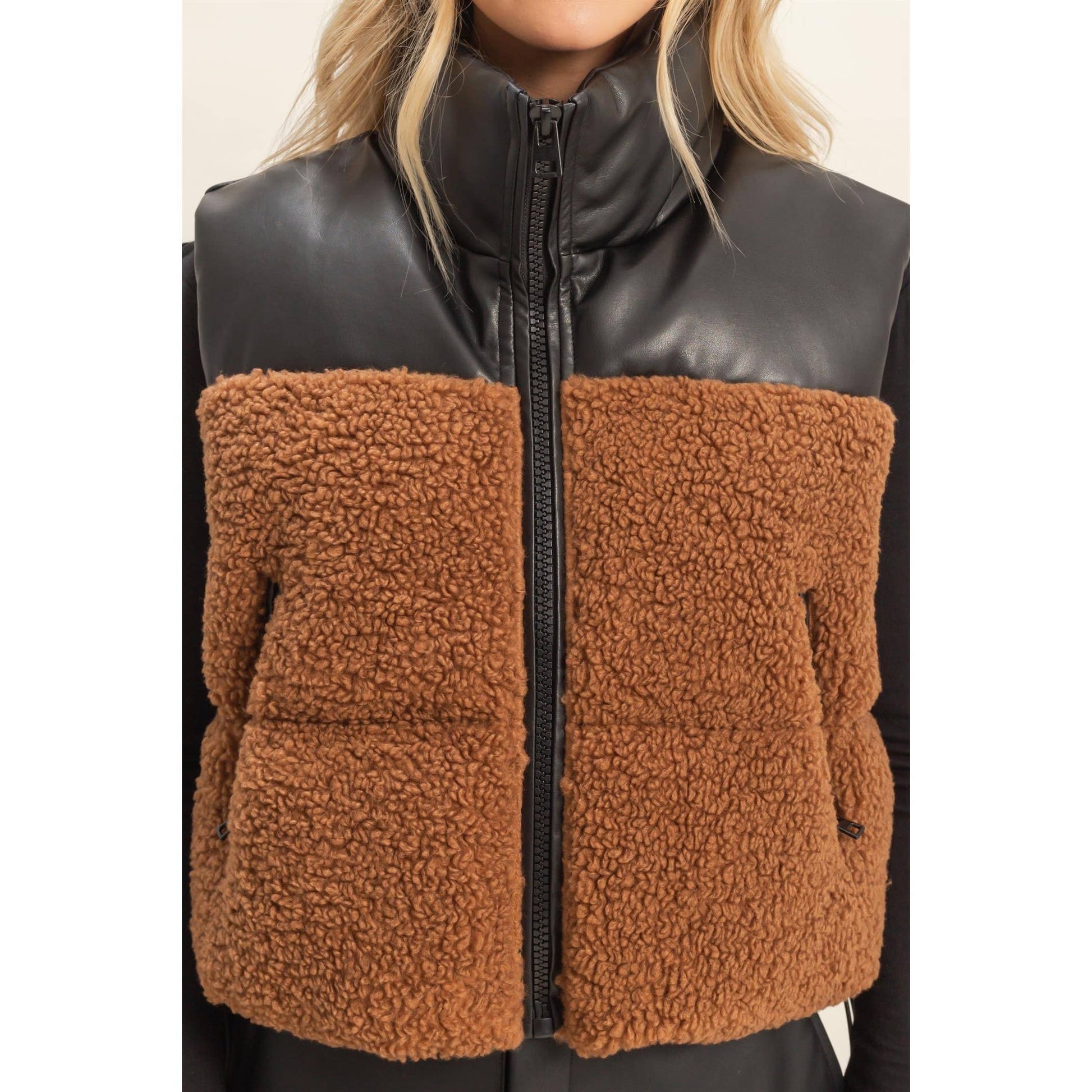 Layer up with this stunning sherpa and PU puffer vest that effortlessly combines warmth with contemporary edge. The striking contrast between plush sherpa and sleek faux leather creates an eye-catching look, while the oversized collar adds instant sophistication. Practical front zipper closure and side slit pockets keep you comfortable and functional. Perfect for transitional weather, this versatile piece elevates any casual outfit into something undeniably chic.