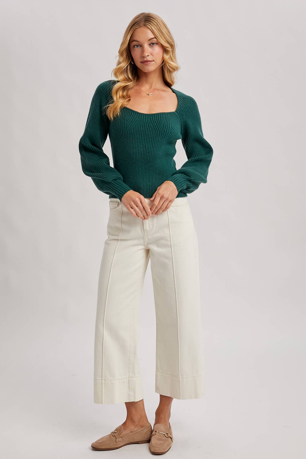 This sophisticated ribbed knit sweater seamlessly merges romantic elegance with contemporary design. The defining sweetheart neckline gracefully frames the décolletage, while delicate V-shaped knit detailing at the bust adds refined visual interest. A fitted, vertically ribbed body creates a streamlined silhouette that beautifully contrasts with dramatic balloon sleeves, finished with snug fitted cuffs for polished proportion. Crafted from sumptuous, soft material, this versatile piece elevates everyday styling—from casual denim to layered ensembles. An investment piece that delivers both comfort and timeless sophistication.